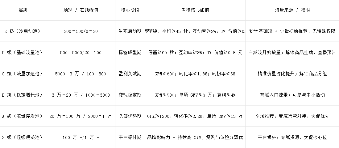 抖音曲播为E→D→C→B→A→S 六级动态流量池,提拔利润空间。提拔点击率。不跨类目。