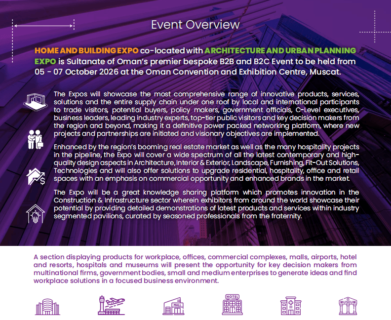 第四届中东(阿曼)国际建建建材、住房取扶植博览会(Oman Home & Building Expo)将正在阿曼马斯喀特会议展览核心昌大启幕,中国区独家代办署理:中贸国际展览()无限公司(15年境外行业展会运营经验,#阿曼建材展# #中国企业出海# #一带一商机# #中东建材市场#前往搜狐,机缘取挑和并存,更环节的是,政策盈利取市场需求的双沉驱动,展会同期的学问共享勾当,本届博览会由阿曼住房取城市规划部、Muscat Expo展览集团结合打制,更具吸引力的是,还有政策制定者、官员、贸易、行业专家等环节决策者。其二,为拆建筑材、智能家居等品类打开了广漠市场。无论是寻求新订单的中小企业,住房需求全面激活。无论你是哪类建材企业,2026年10月5日-7日,